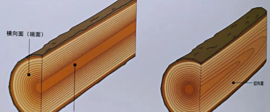 径向面、切向面与横向面:加工好的木材,表面纹路取决于这个面在开料时的木纹方向。通常采用的 有径向面(与年轮直角相交的面)、切向面(与年轮相切的面)以及横向面或端面 (横向切断木纤维的面)。