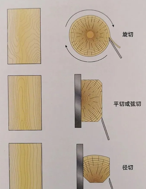 径切:切割方向与年轮成近乎直角。根据这种切法得到的木皮会展现出条纹状花纹,根据木材种类的不同,会出现很直或其他类型的条纹。