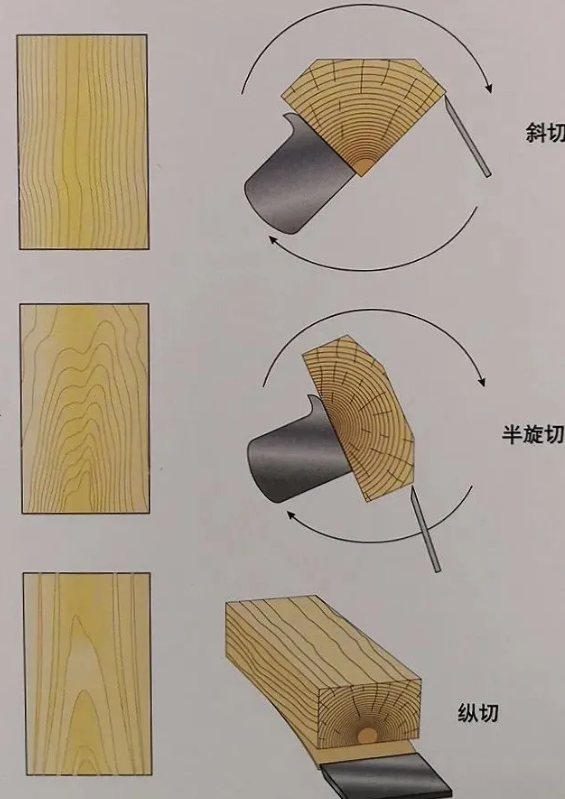 旋切:用非常锋利的刀切割安装在车床上的原木。这种方式类似把一卷纸 打开。顺着年轮被切下来的木皮上,会出现复杂多样的图案。这样可以得到非 常宽的木皮。