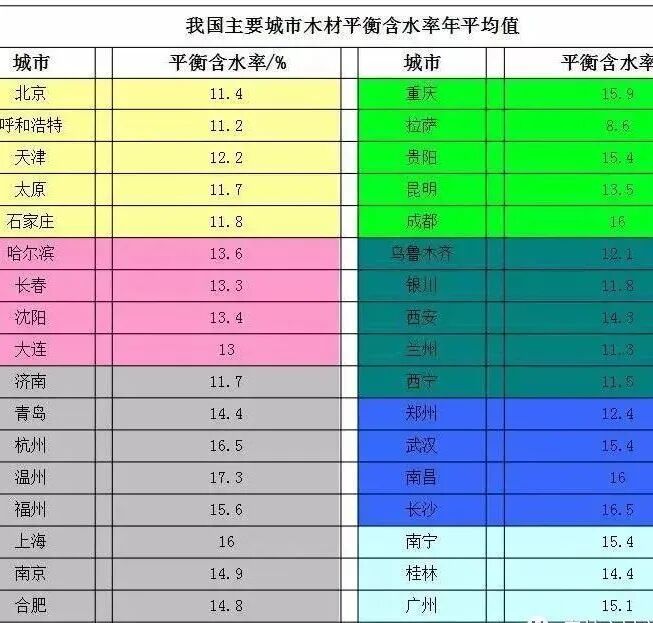 我国是一个幅员辽阔、气候多样的国家,从西北到东南气候逐渐温暖、潮湿,因此木材的平衡含水率从西北向东南逐渐增高,变化规律明显,并可划分为9%、11%、13%、15%、16%等几个带状区。